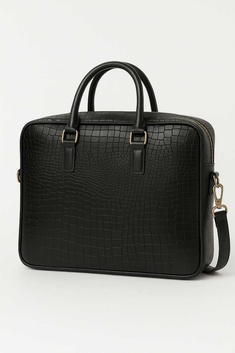 Black Crocodile-Embossed Leather Laptop Bag: Sleek Briefcase