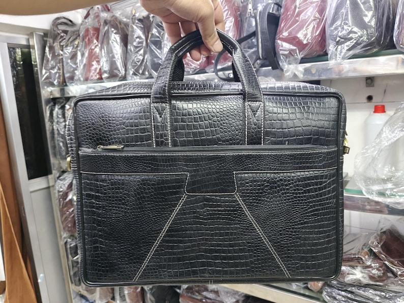 Elevate your professional style with this handcrafted black croc-embossed genuine leather laptop bag, designed for those who value sophistication and durability. Made from high-quality full-grain leather with a refined crocodile texture, this bag exudes a bold, executive look suitable for business meetings, travel, or daily office use.