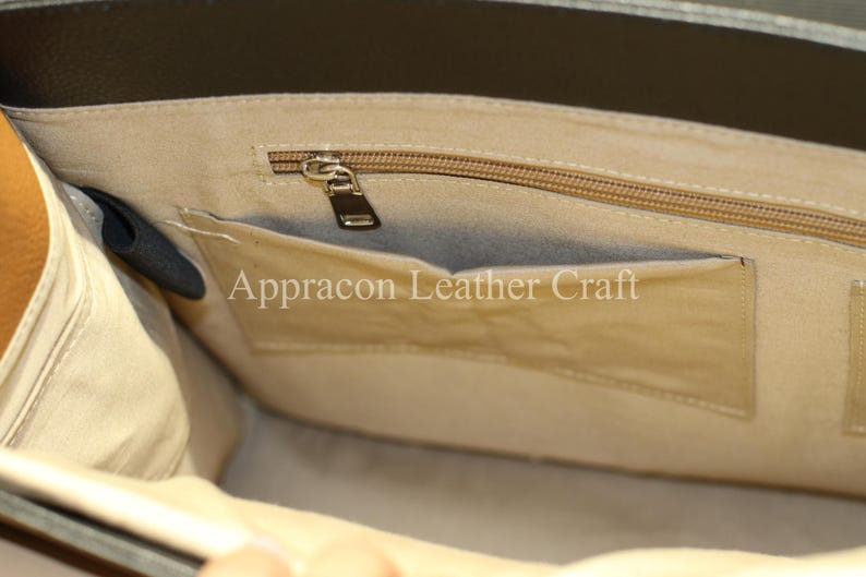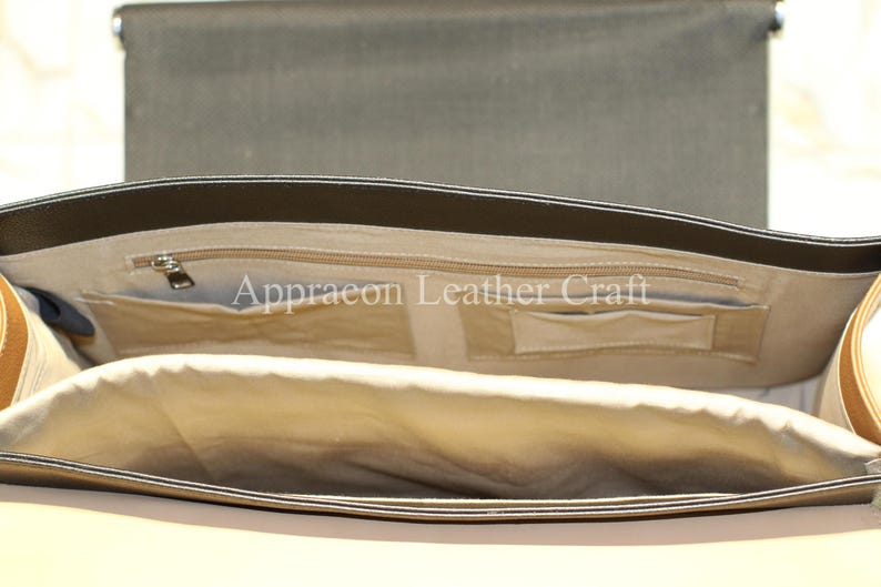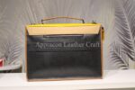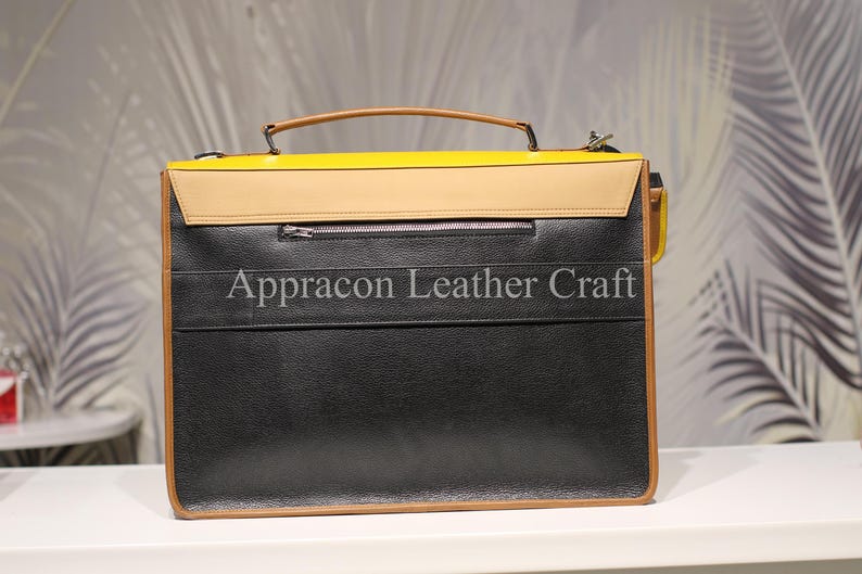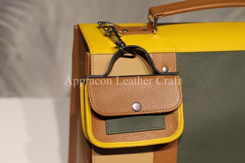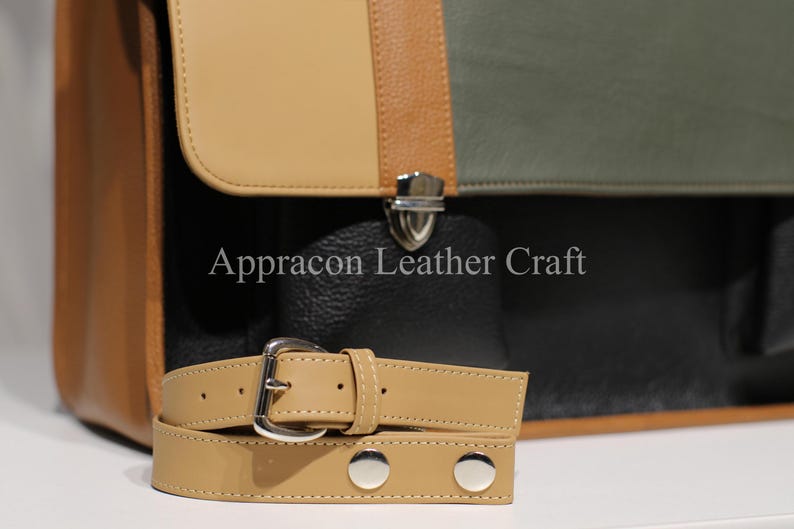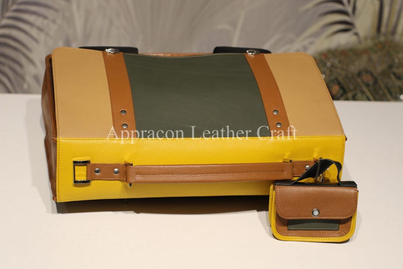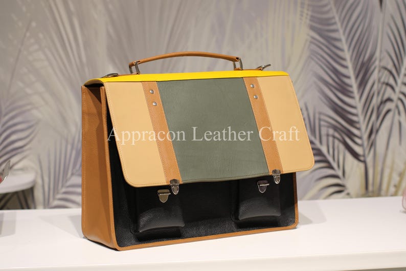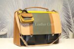 Introducing a stunning handcrafted leather messenger bag from Appracon Leather Craft, designed for those who value style, durability, and master craftsmanship. This unique piece blends multiple leather tones—olive green, tan, black, and a bold yellow accent—creating a standout accessory perfect for everyday use, work, or travel.